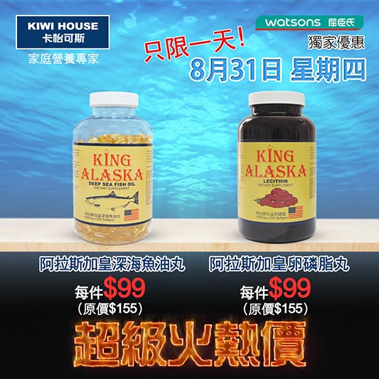 8月31日(星期四),阿拉斯加皇深海鱼油丸和阿拉斯加皇卵磷脂丸均以超级火热价$99发售!(原价$154.9)
