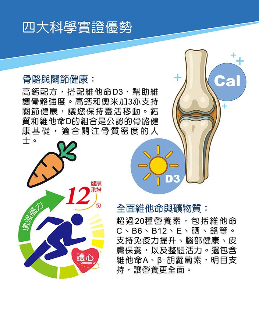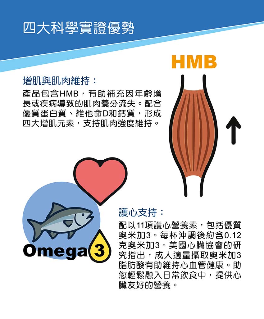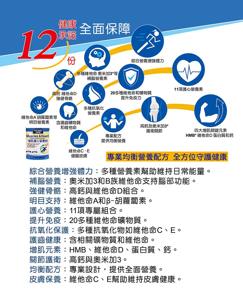 - 補充因年齡或疾病而流失的肌肉養份,維護關節骨骼健康,更含多種護心營養素,護心健關。