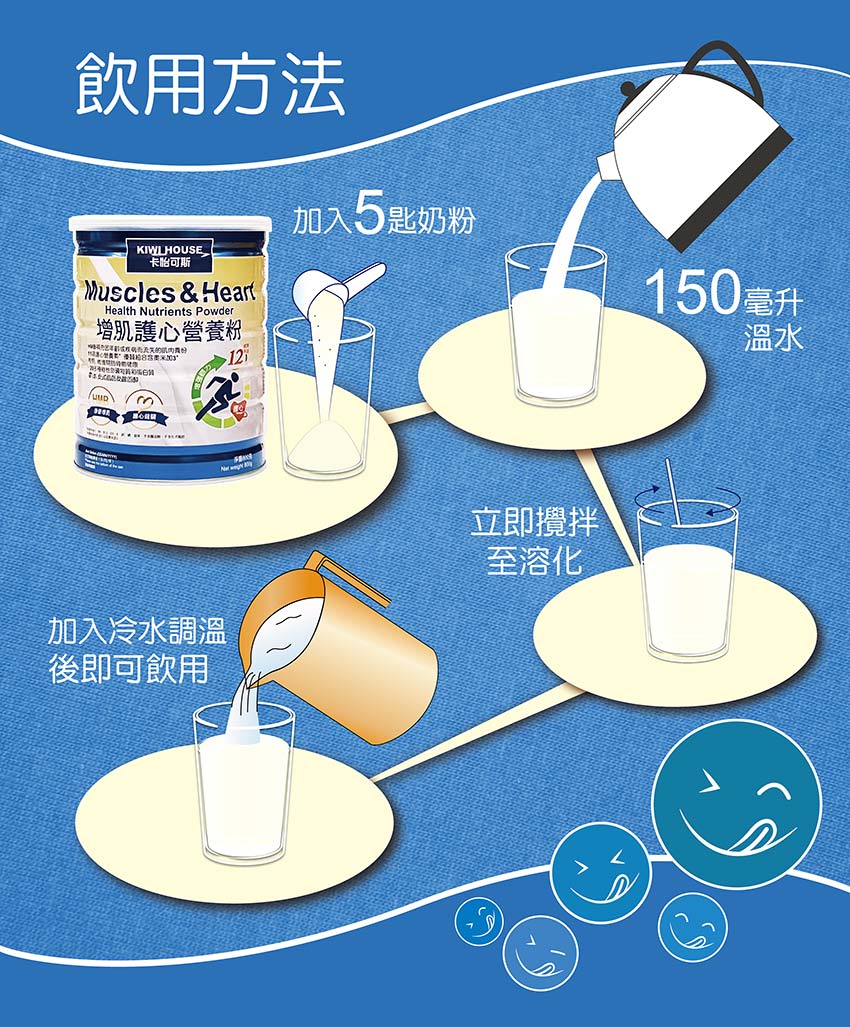 - 將5匙(約30克)卡怡可斯增肌護心營養粉,放於150毫升溫開水中攪拌後飲用