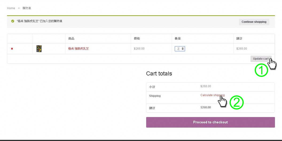 1. 輸入購買數量,點擊按鈕「Update cart」更新購物車。