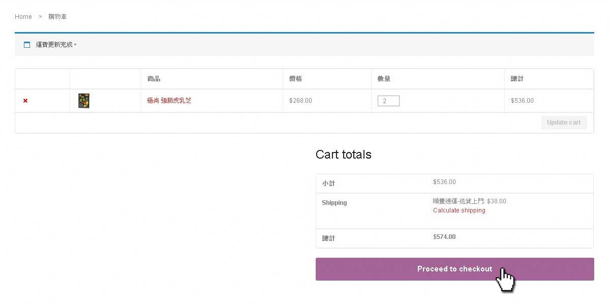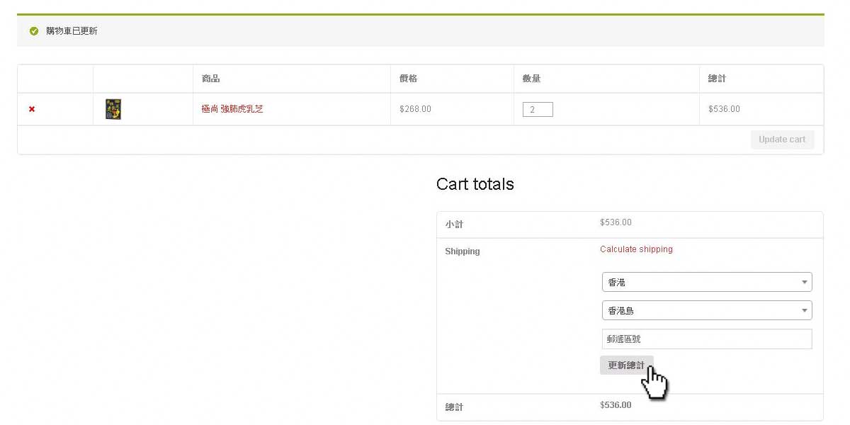 選擇運送地區,點擊「更新總計」按鈕即時計算運費。