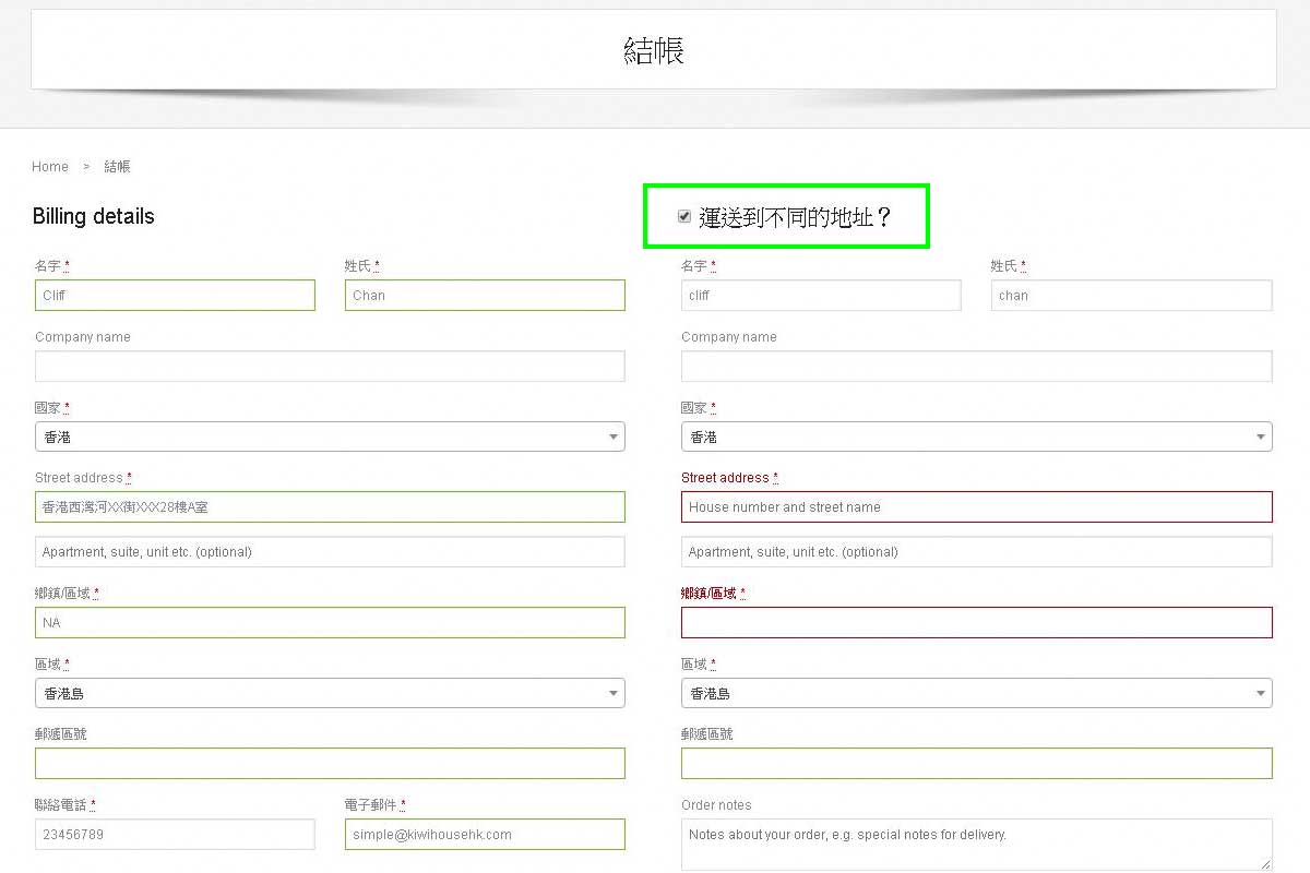 取消勾選「運送到不同的地址?」,輸入收取商品的運送地址、聯絡電話及電子郵件。請確認輸入的資料正確無誤,以免派遞失敗。聯絡電話將提供予派遞人員以安排送貨事宜。當我們完成投寄手續後,將透過電郵向閣下發送物流追蹤編號,以線上查看物流情況。