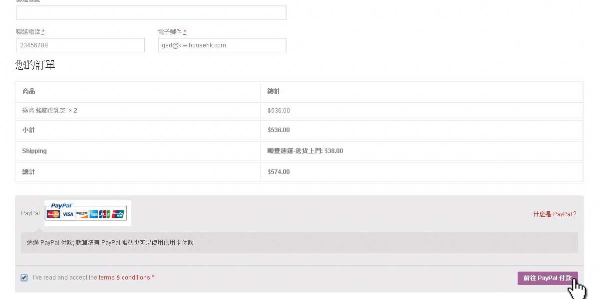 確認訂單後點擊「前往PayPal付款」按鈕進行結帳程序。